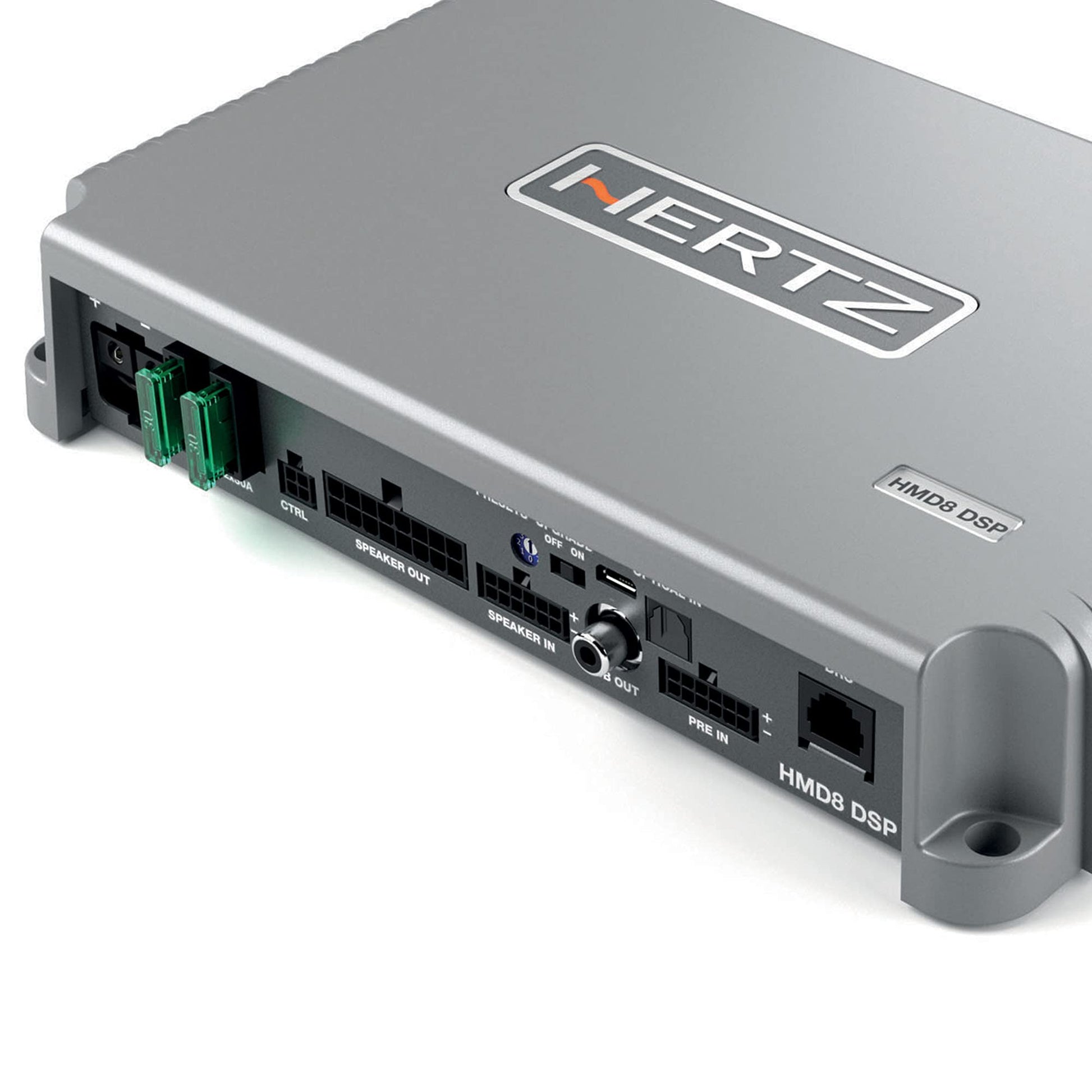 The Hertz HMD8 DSP is an 8-channel marine-grade amplifier delivering 85 watts RMS per channel at 4 ohms. Designed for high-quality audio in boats, ATVs, and powersports vehicles, it provides clean, distortion-free sound across multiple speakers. This amplifier ensures precise, balanced audio performance for complex multi-speaker setups.