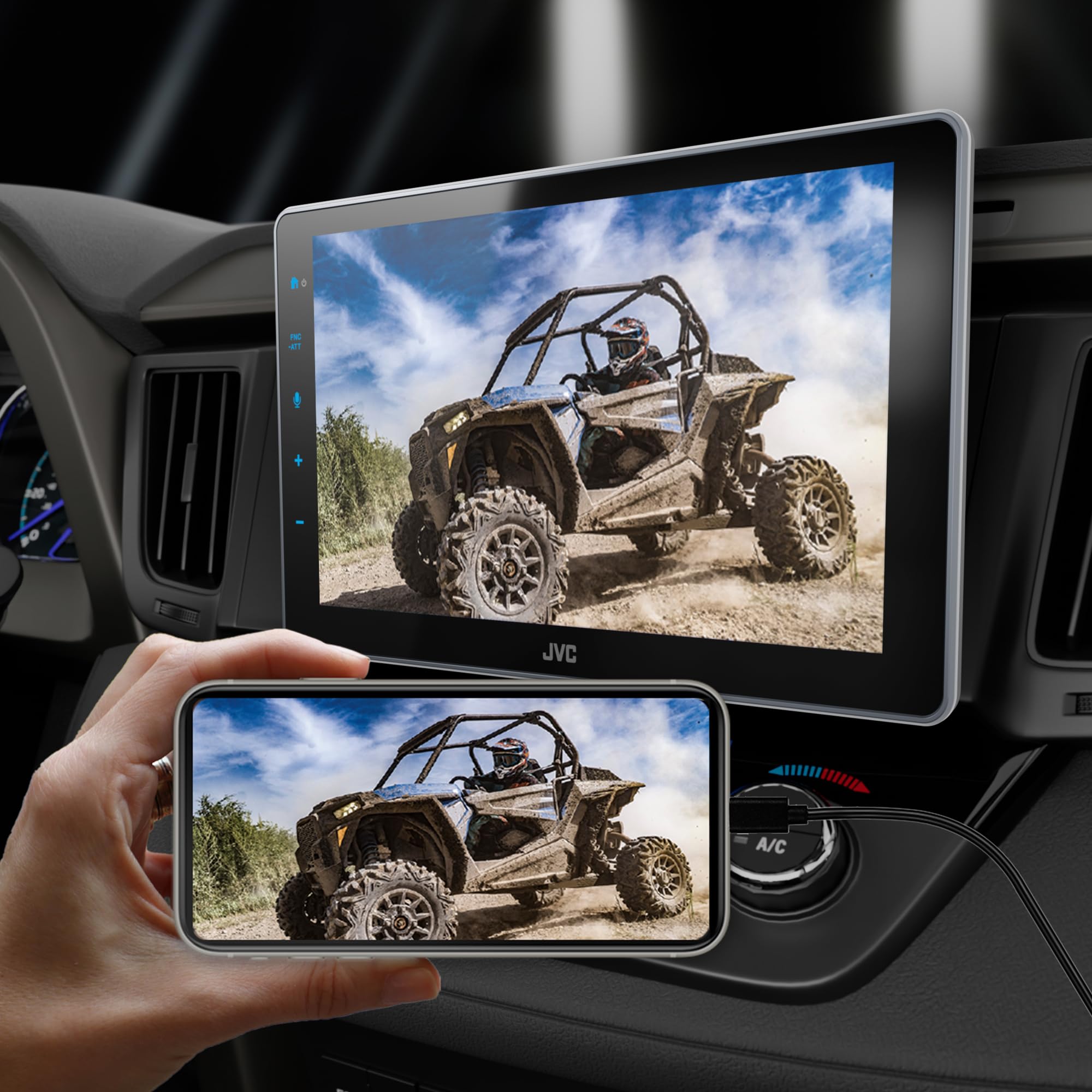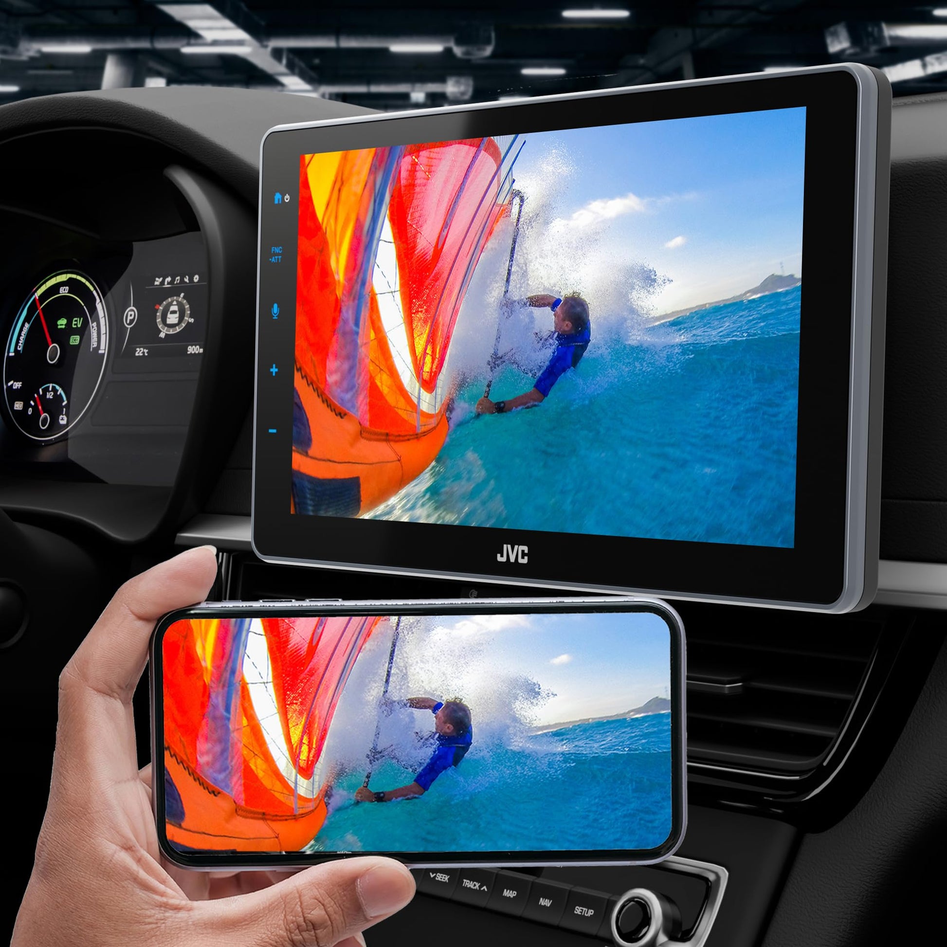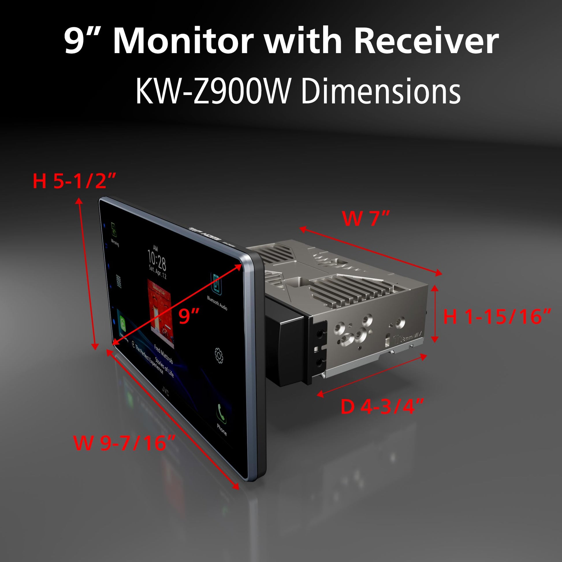 The JVC KW-Z900W is a bold, modern multimedia receiver built for drivers who want a dramatic screen upgrade and cutting-edge wireless connectivity. Its massive 9-inch floating capacitive touchscreen delivers a sharp 1280×720 full HD resolution, transforming your dashboard with a sleek, tablet-style display that’s a huge step up from small factory radios. The adjustable floating design uses a 1-DIN chassis that fits both single and double DIN openings, allowing flexible installation while avoiding vents or climate controls.