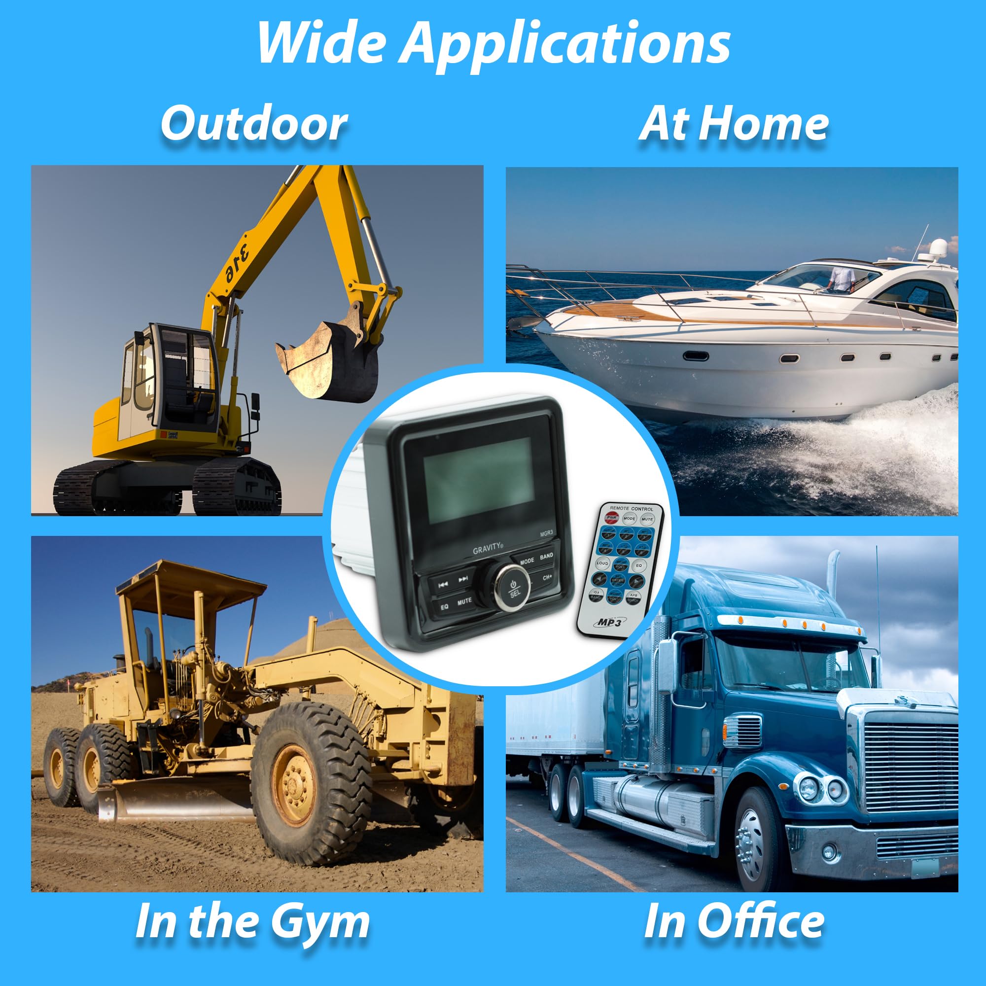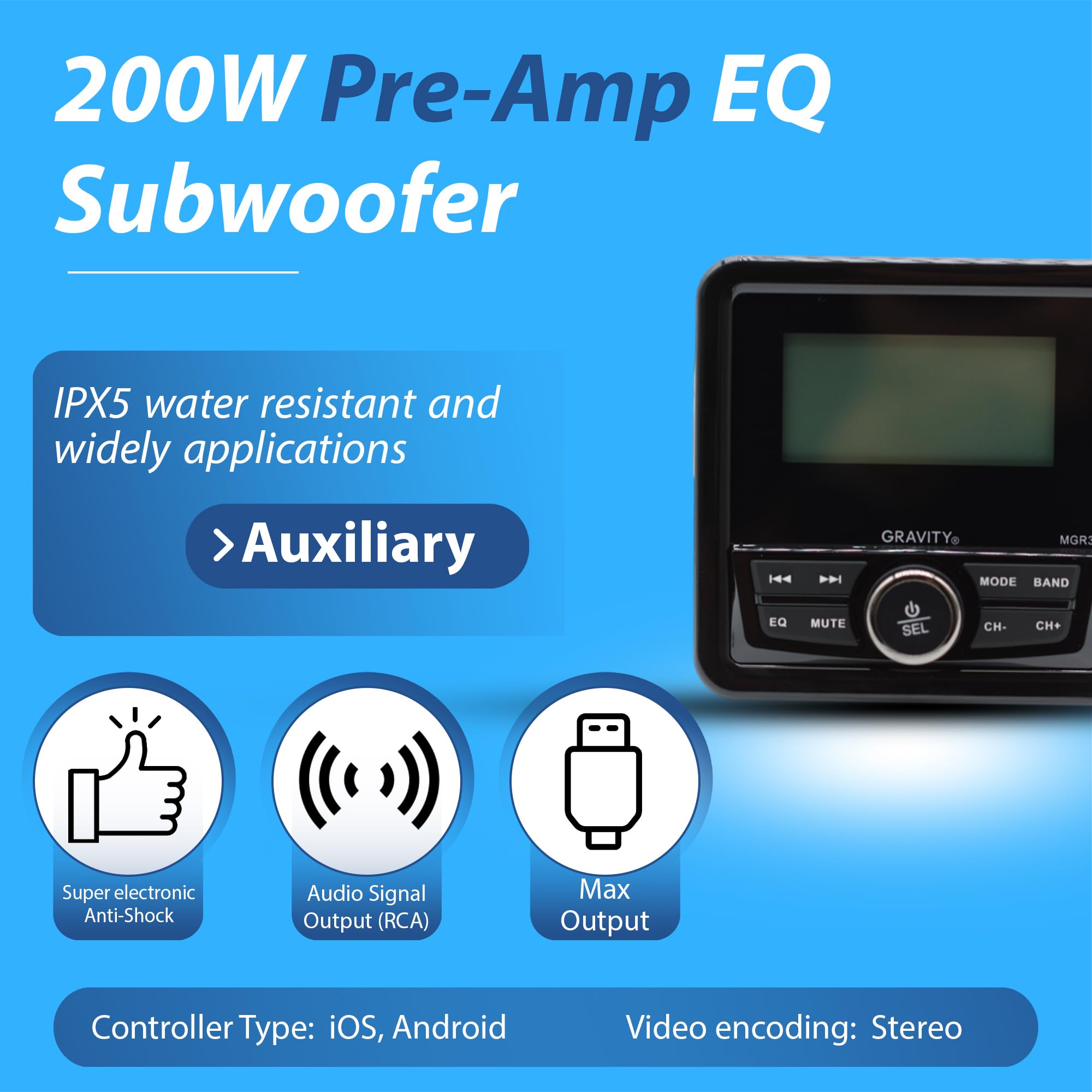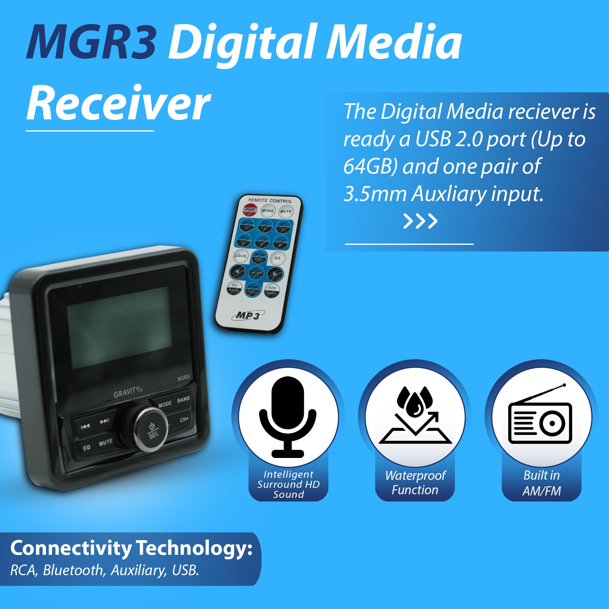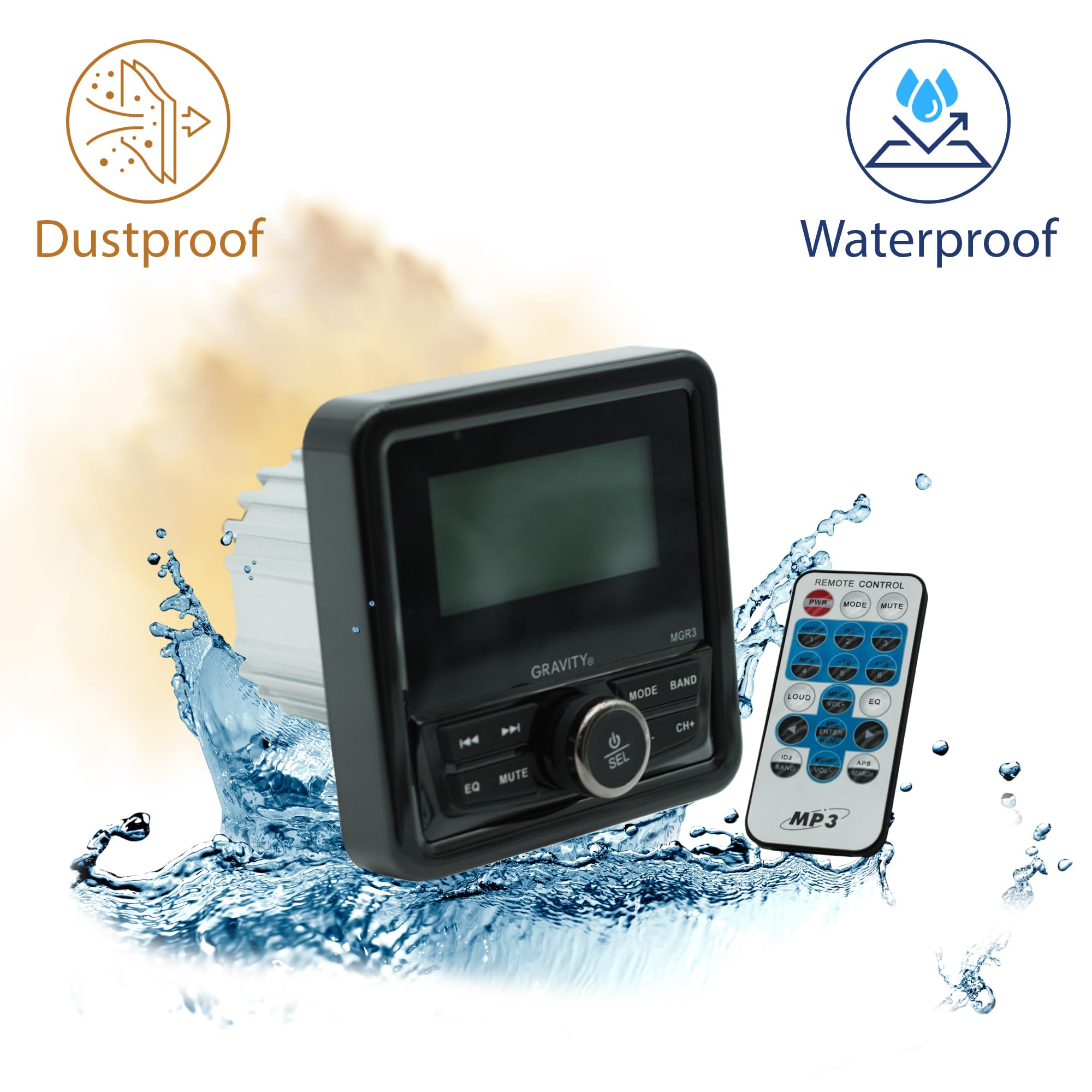 Designed for durability, the Gravity MGR3 features a rugged, weatherproof build that protects against moisture, dust, and extreme weather conditions. Whether you're out on the water or tackling rough terrain, this stereo ensures continuous, high-performance audio playback. The built-in equalizer offers preset sound modes such as rock, pop, and classical, allowing you to customize your listening experience. Compact and easy to install, the MGR3 is the ultimate audio upgrade for outdoor and marine environments.