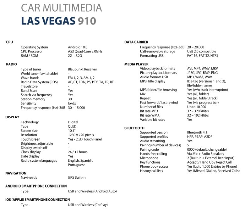Experience your media like never before with the BLAUPUNKT LASVEGAS910's extra-large 10.1-inch QLED touchscreen. With a resolution of 1280 x 720 pixels, the display provides stunning visuals, ensuring you can easily view navigation maps, play videos, and control your music with precision. The 2.5D touch panel is responsive and user-friendly, making it simple to access all the features and apps you need while on the road.