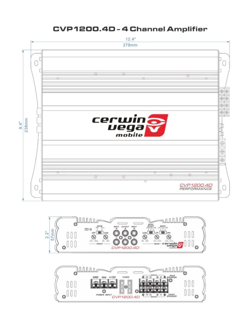 Engineered for superior sound and efficiency, the Cerwin Vega CVP1200.4D 4-Channel Class AB Amplifier produces rich, dynamic audio with clear highs, detailed mids, and controlled lows. The amplifier features high/low-level inputs, selectable high-pass and low-pass crossovers, and thermal protection to ensure safe operation. Its compact chassis allows versatile installation while maintaining Cerwin Vega’s signature sound quality, making it perfect for drivers seeking a powerful, full-range solution for their vehicle audio system.