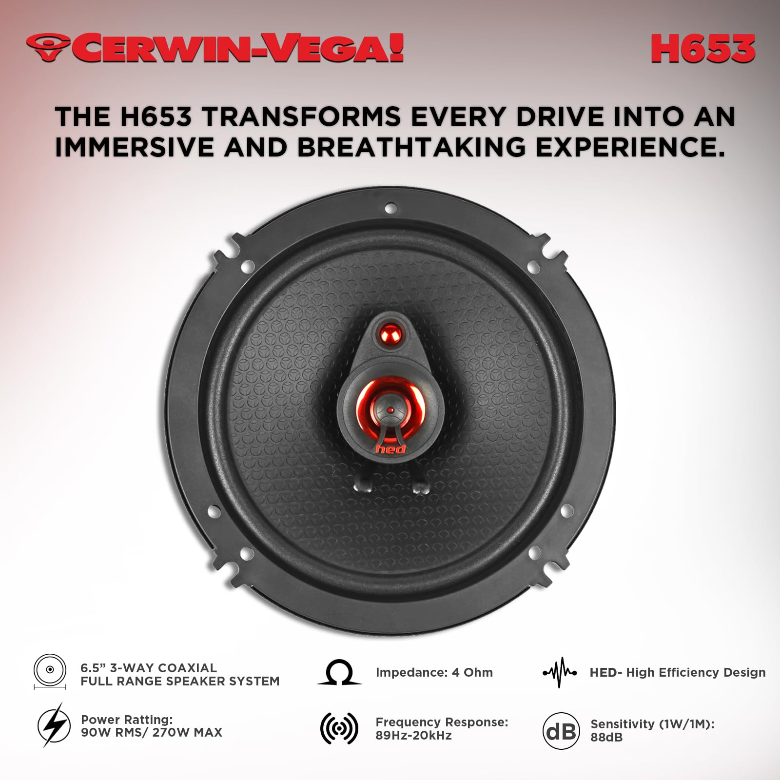 The Cerwin Vega H653 HED 2025 Edition 6.5” 3-Way Coaxial Speakers deliver full-range audio with deep midbass, clear mids, and sparkling highs. Engineered for vehicles with 6.5” speaker locations, these speakers upgrade factory systems with rich, dynamic sound. Perfect for all music genres, the H653 ensures a clean, distortion-free listening experience while filling your cabin with balanced, immersive audio.