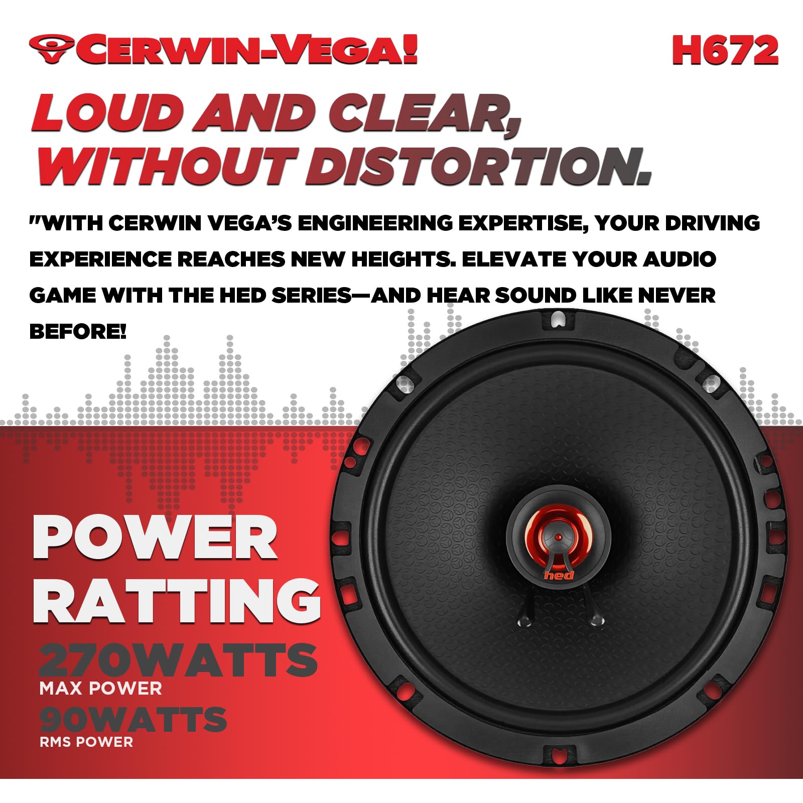 Built with Cerwin Vega’s HED technology, the H672 features a reinforced cone for midbass accuracy and an integrated tweeter for precise high-frequency reproduction. The efficient motor structure ensures high sensitivity, delivering strong output even from factory head units. Durable construction and low-distortion design make these speakers reliable and long-lasting for consistent in-car audio performance.
