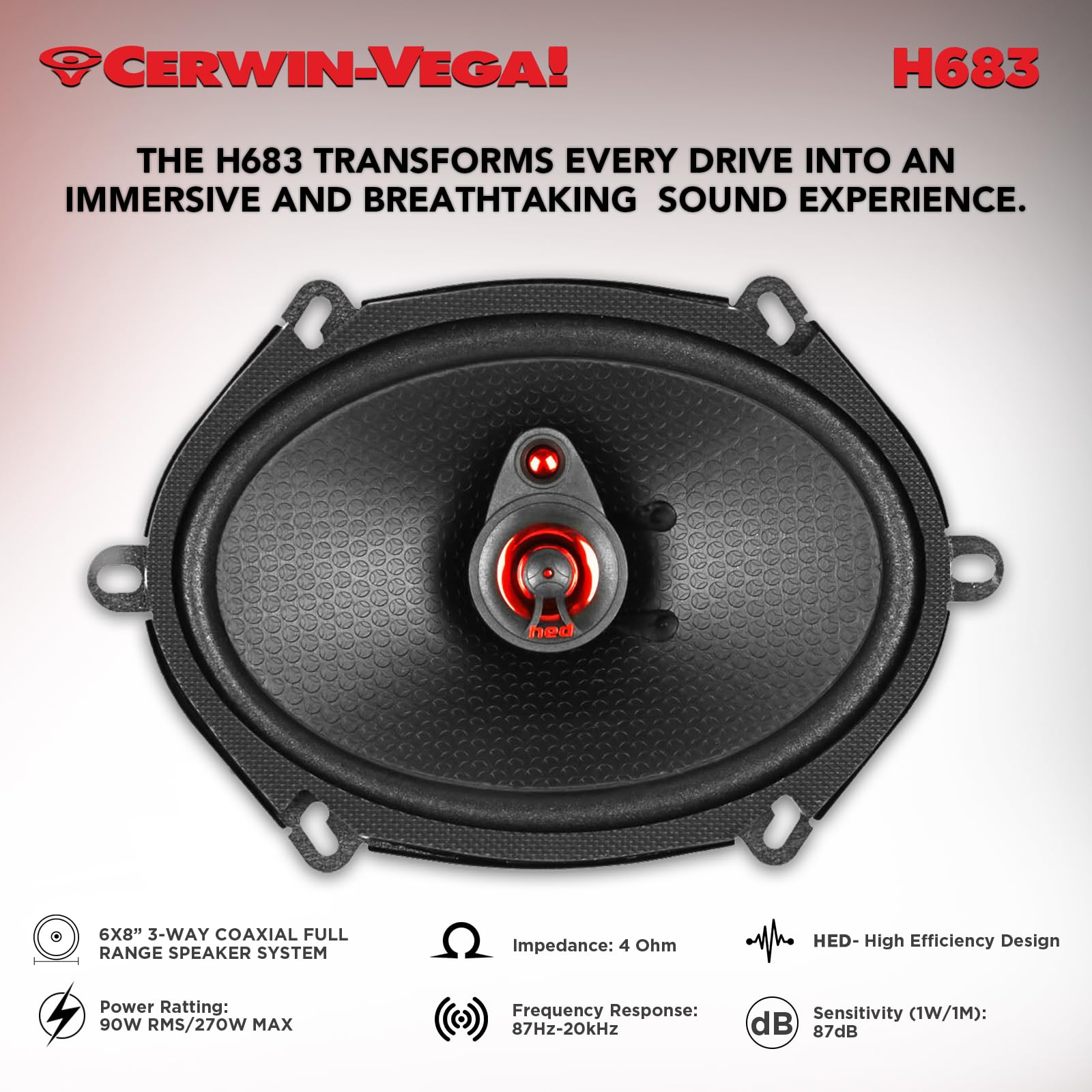 The Cerwin Vega H683 HED 2025 Edition 6.8” 3-Way Coaxial Speakers deliver full-range sound with deep midbass, clear mids, and crisp highs. Designed for vehicles with 6.8” speaker locations, these speakers provide a significant upgrade over factory systems. Perfect for music enthusiasts, the H683 ensures distortion-free, dynamic audio that enhances every genre of music with rich, immersive sound.
