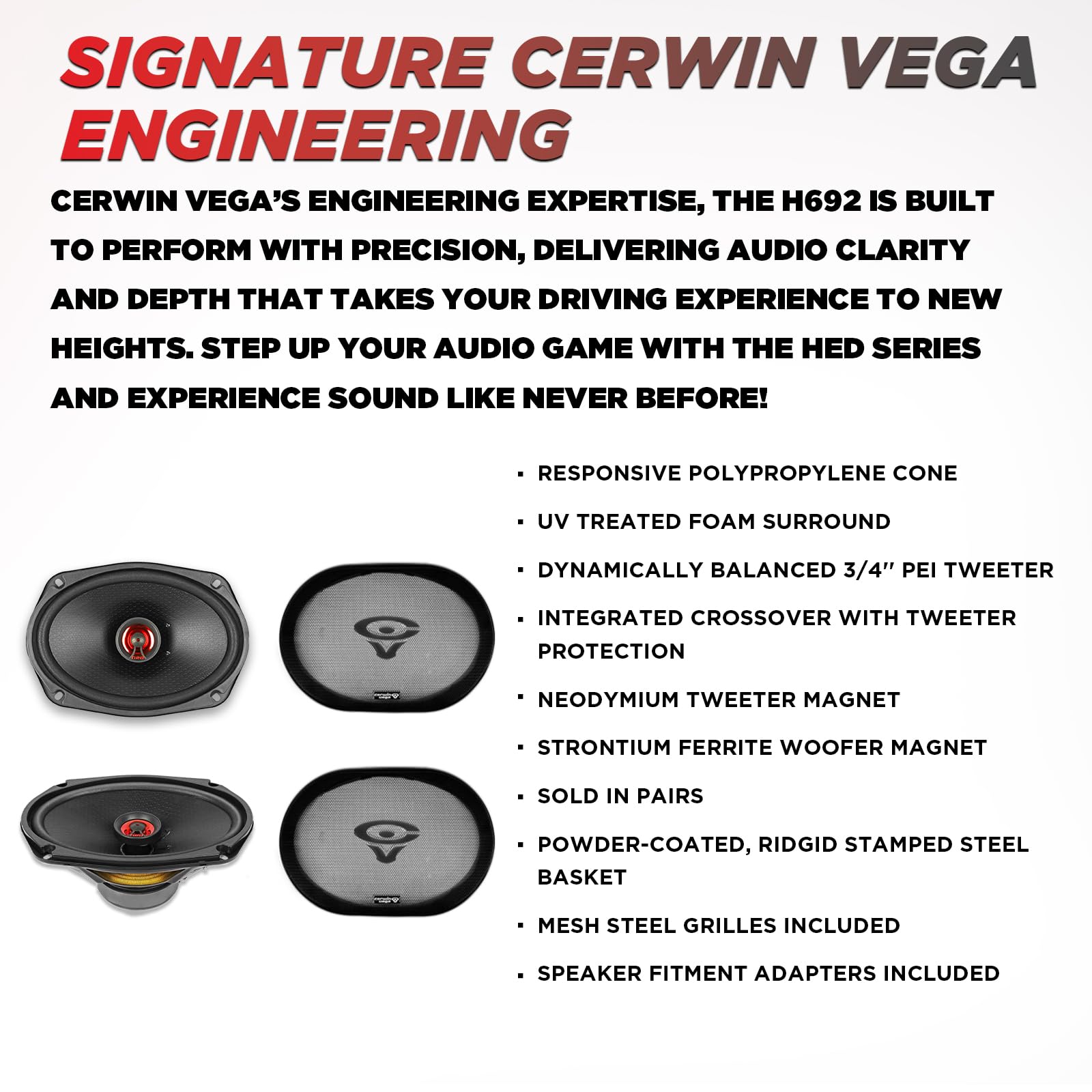 The Cerwin Vega H692 HED 2025 Edition 6.9” 2-Way Coaxial Speakers deliver rich, full-range sound with punchy midbass, clear mids, and crisp highs. Designed for vehicles with 6.9” speaker locations, these speakers provide a major upgrade over factory systems. Ideal for all music genres, the H692 ensures distortion-free, dynamic audio that fills your vehicle with immersive sound.