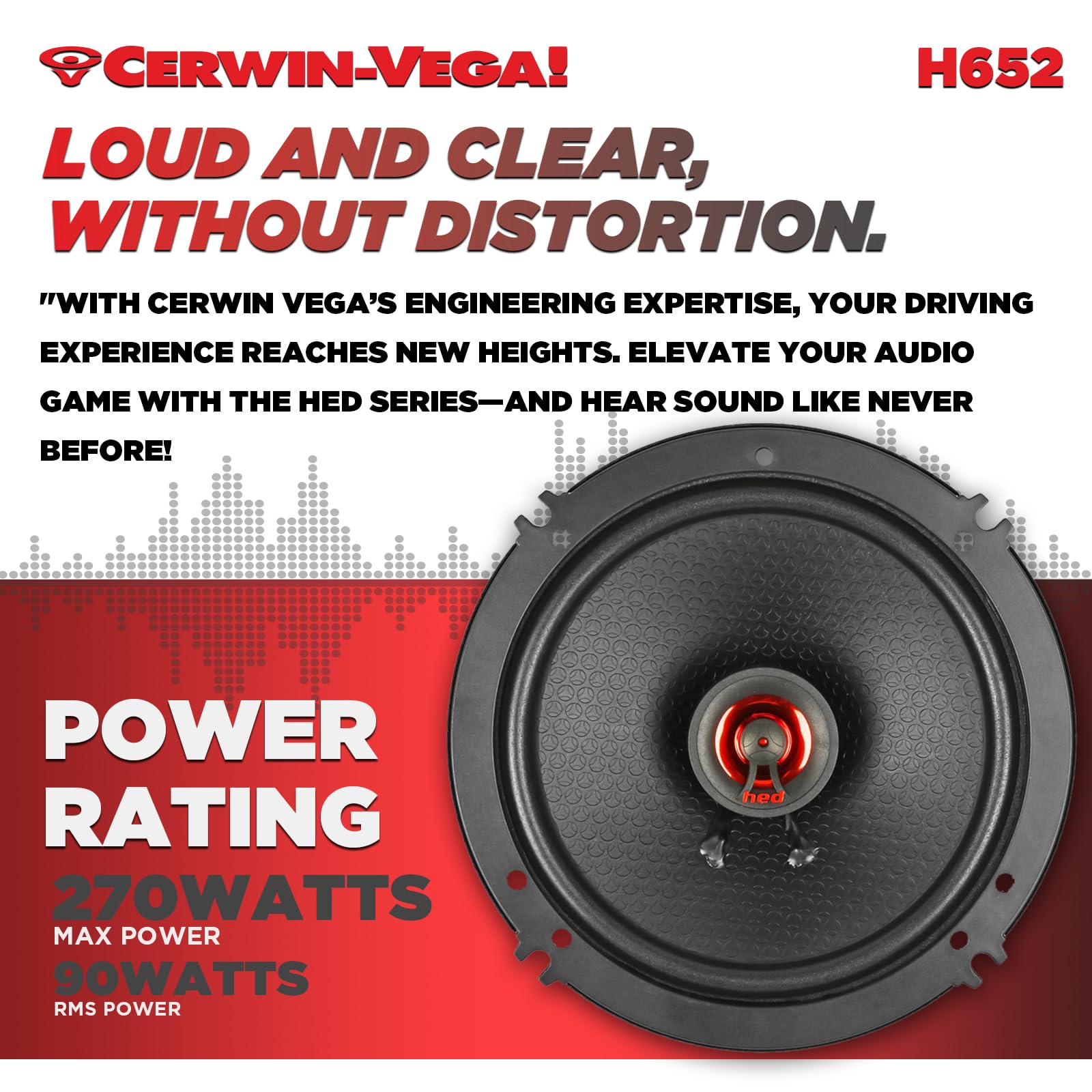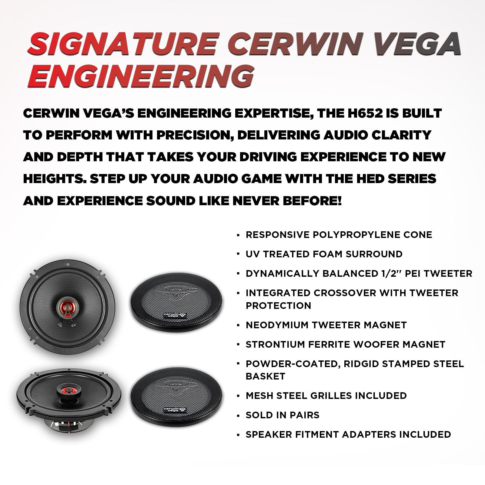 Built with Cerwin Vega’s HED technology, the H652 features a reinforced multi-layer cone and an efficient motor structure for accurate sound reproduction. The integrated tweeter enhances high-frequency detail, delivering smooth and crisp treble while maintaining clean mids. Engineered for durability and low distortion, these speakers provide consistent performance even at higher volume levels.