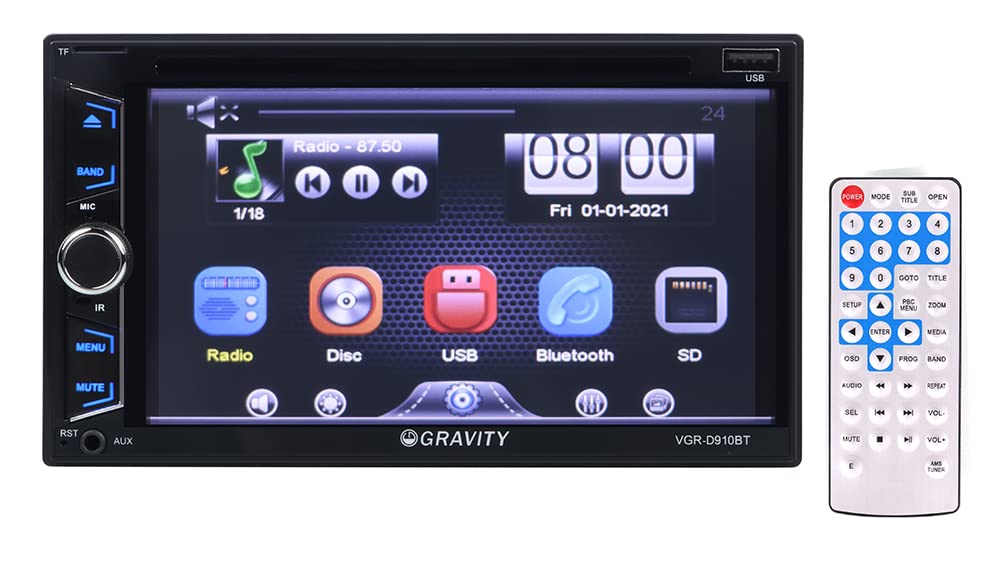 The Gravity VGR-D910BT is packed with playback options, including a built-in CD/DVD player, USB, SD card, and FM/AM radio. It supports multiple audio and video formats, allowing you to enjoy digital media in various ways. Additionally, the Bluetooth functionality enables hands-free calling and music streaming, while the built-in microphone ensures crystal-clear communication. The stereo also features multiple inputs and outputs, including RCA, AV, camera input, and subwoofer outputs, making it a versatile multimedia hub for your car.