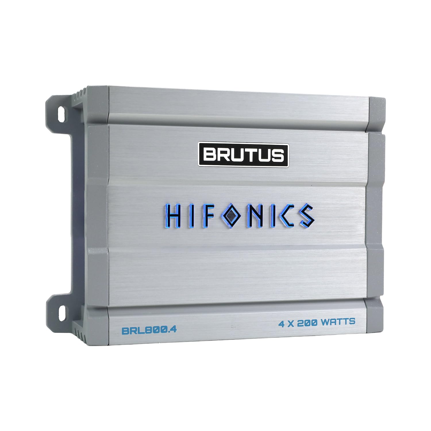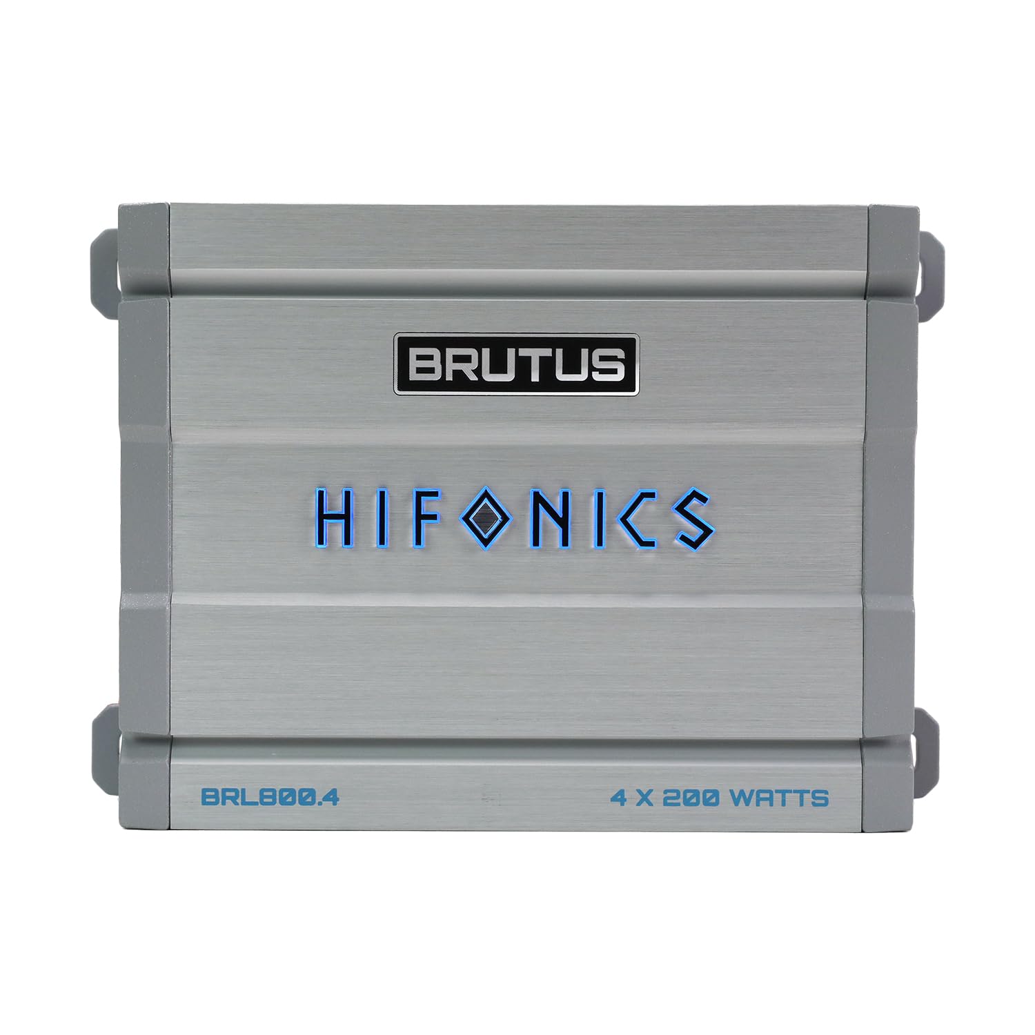 For both function and style, the amplifier features a stylized illuminated logo that can be set to constant blue, VU meter mode, or fully off. In VU meter mode, the logo visually tracks audio output levels, making gain adjustment easier and more intuitive. Comprehensive protection circuitry guards against over-voltage, under-voltage, short circuits, overcurrent, and thermal overload, ensuring dependable operation under demanding conditions. With secure molded terminals, delayed turn-on functionality, and flexible 4-channel or bridged operation, the Hifonics Brutus BRL800.4 is a powerful and refined solution for modern car audio systems.