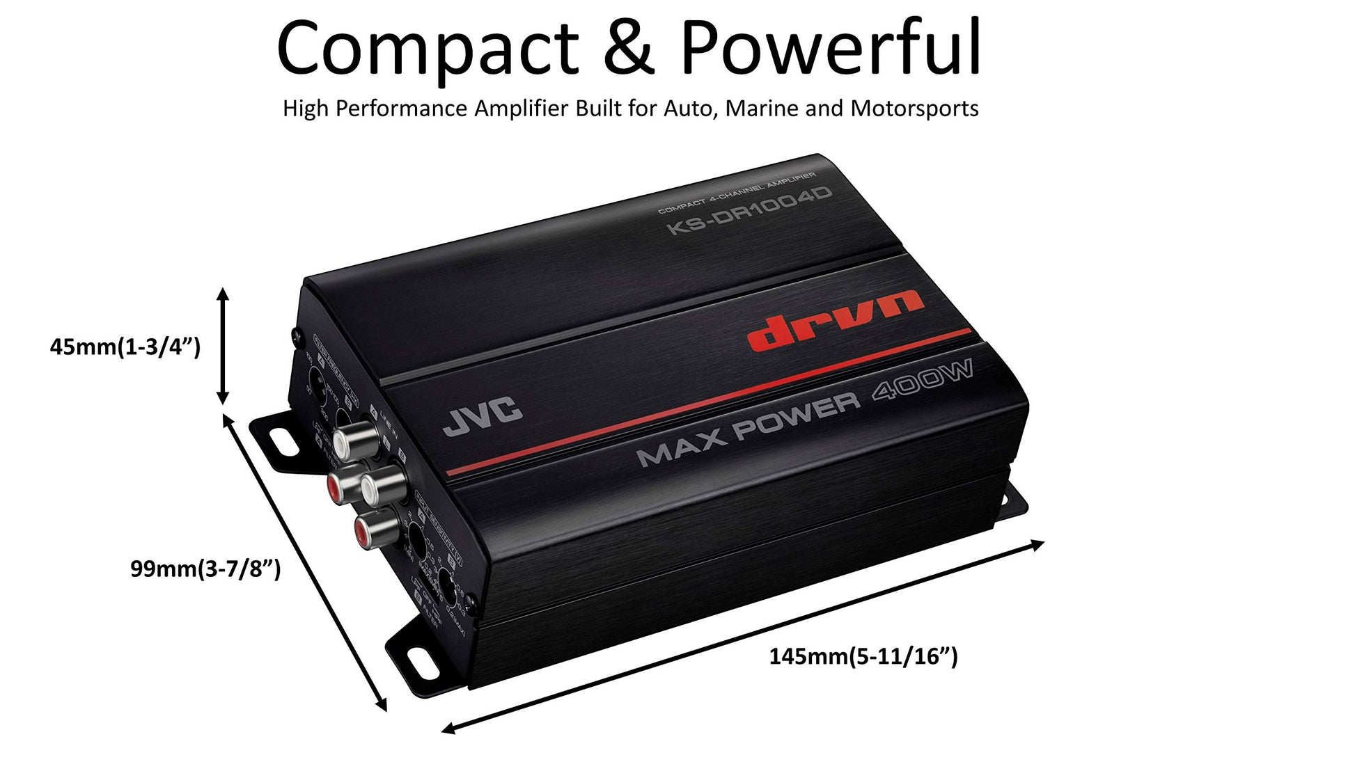 Experience superior sound quality with the JVC KS-DR1004D 4-Channel Class D Amplifier. Despite its compact size, this amplifier delivers an impressive 45 watts RMS per channel (90 watts RMS bridged), ensuring crystal-clear and distortion-free audio. Its versatile design makes it an excellent choice for cars, motorcycles, and boats, fitting even in tight spaces to enhance your listening experience.