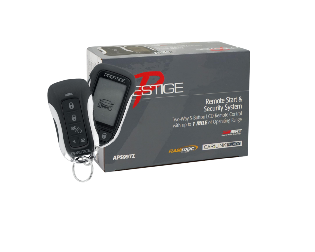 The Prestige APS997Z is a feature-packed remote start and alarm system designed to provide convenience and top-tier security for your vehicle. With a remarkable 1-mile range, this system includes a two-way LCD confirming transmitter and a one-way transmitter for flexible control. The glass mount antenna with a built-in LED light ensures strong signal reception, while Flash Logic FLCART compatibility allows seamless integration with additional modules. Whether you need to start your car remotely or monitor its security status, the APS997Z delivers advanced protection and convenience.