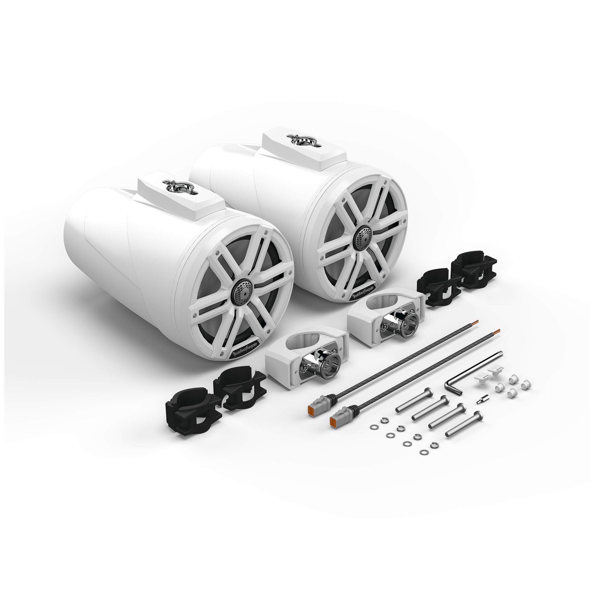 Built to withstand the elements, the M2WL-8 Wake Tower Speakers feature an Element Ready™ design and are IPX6 rated, offering reliable protection against water, UV rays, corrosion, and dust. Their rugged construction ensures long-lasting durability, whether you're cruising on fresh or saltwater. The speakers’ 360-degree rotation mounting options (direct mount or clamp mount) make them flexible for installation on wake tower bars ranging from 1.5” to 3”, and they come with both stainless steel and white sport grille inserts to suit your aesthetic.