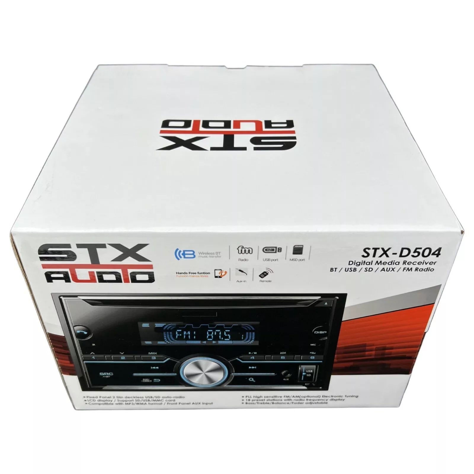 The STX Audio STX-D504 digital media receiver is designed to bring high-quality sound and effortless connectivity to your vehicle. Featuring Bluetooth for hands-free calling and wireless music streaming, this receiver keeps you connected while on the road. Enjoy multiple media playback options, including USB, SD card, and AUX input, ensuring you have access to your favorite tunes in any format. With an integrated FM radio tuner, you can stay updated with the latest news, music, and talk shows.