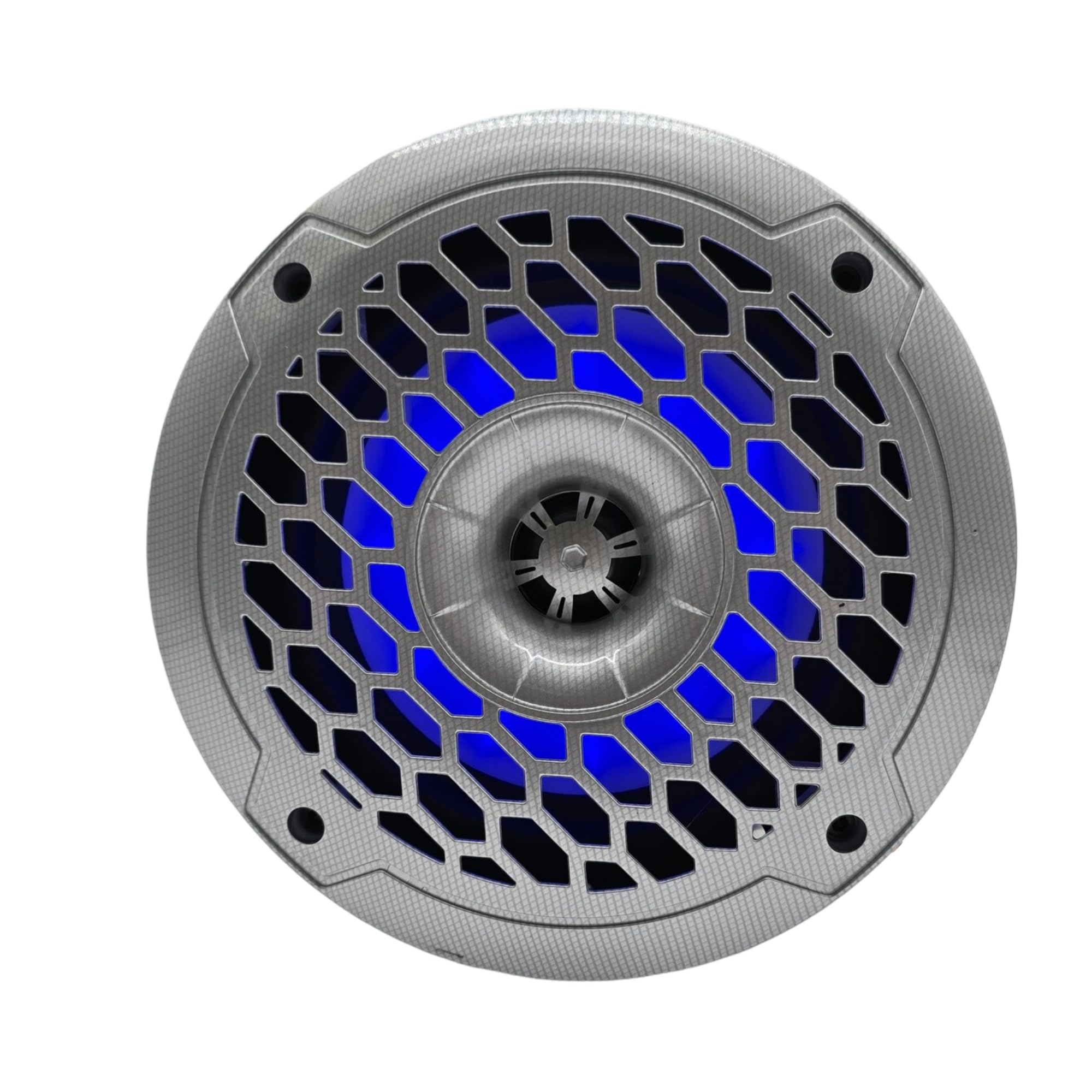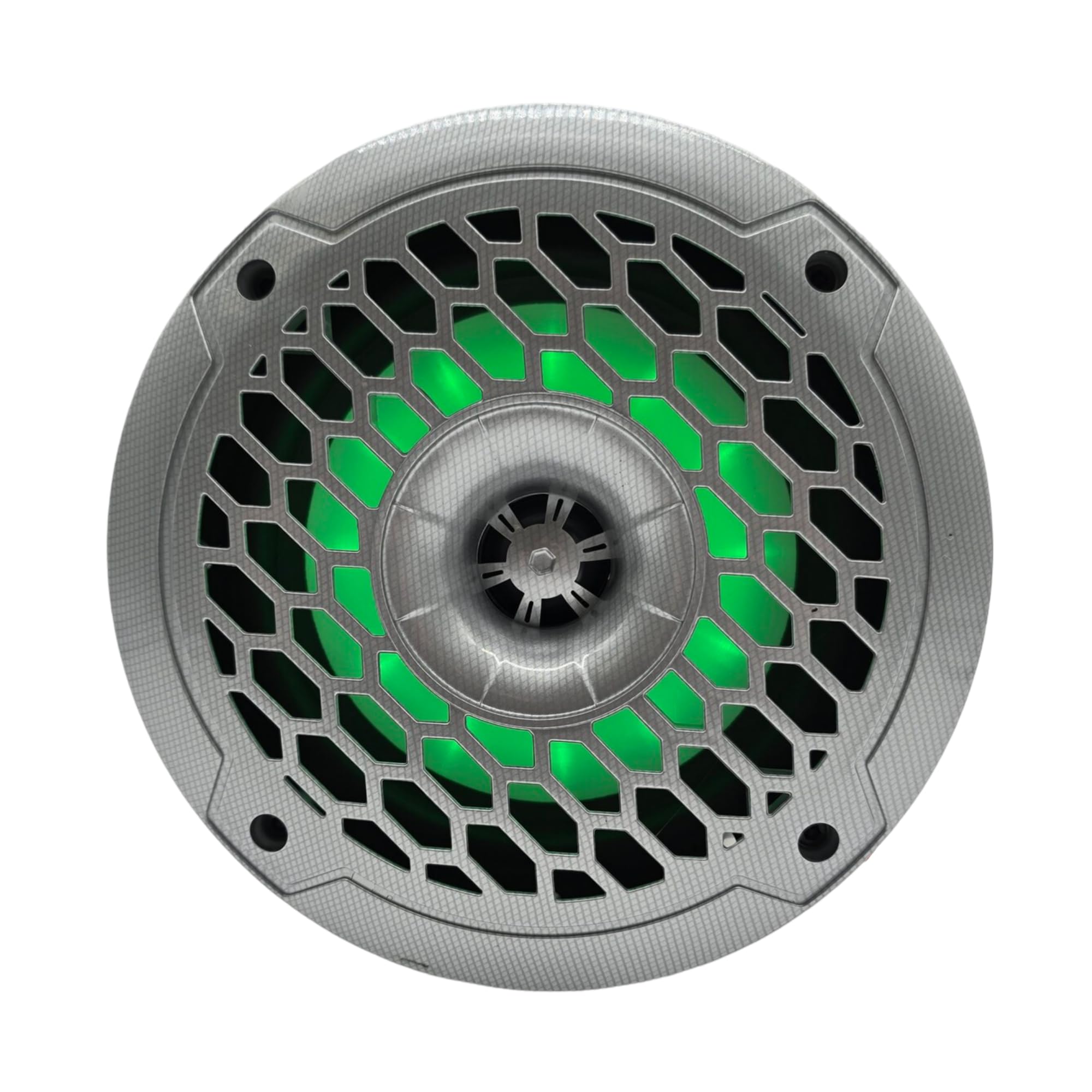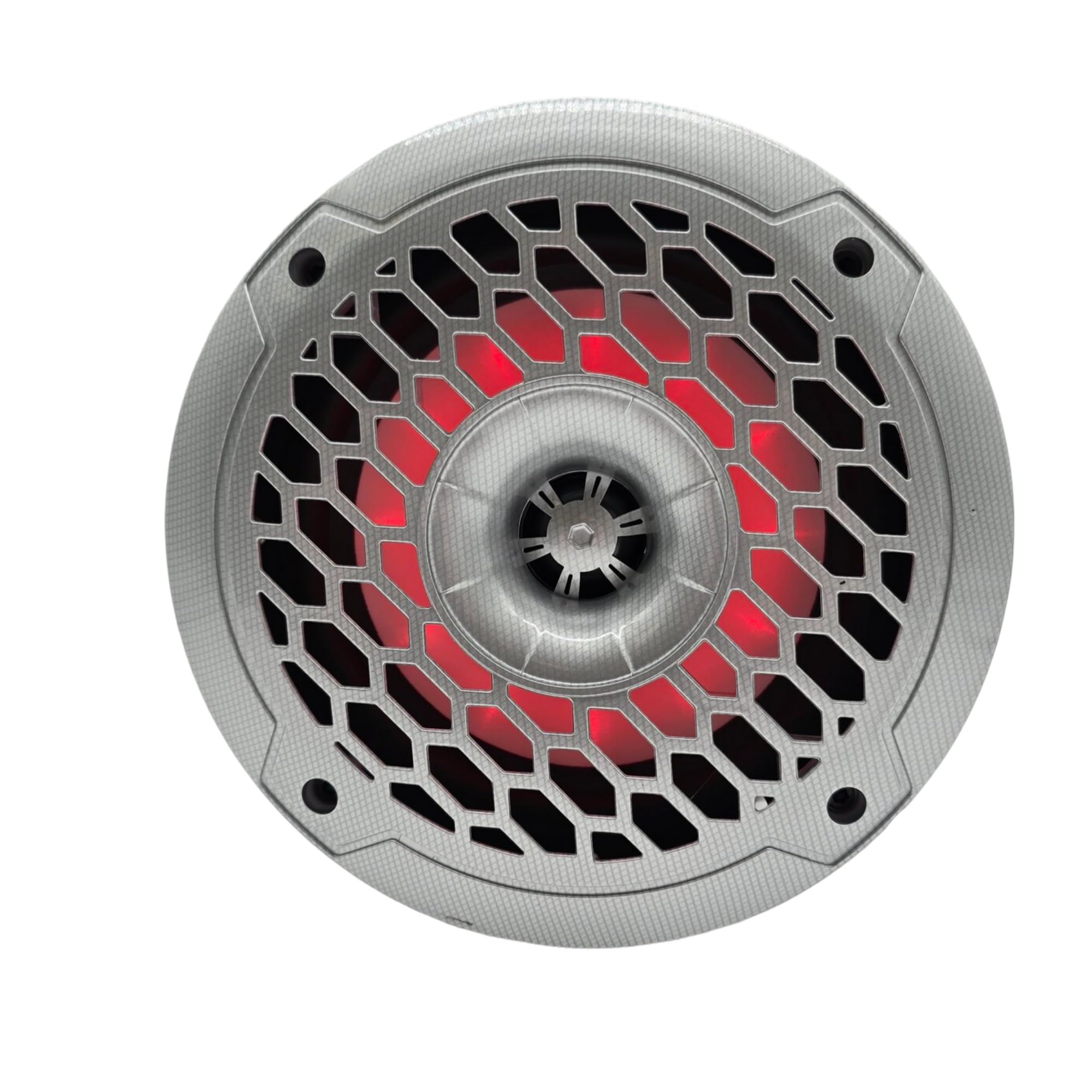 Details: Stylish Marine Speakers with RGB LED Lighting and Gray Finish The Warzone WZ652MTG 6.5-Inch Marine Box Speakers are designed to combine high-quality sound with sleek aesthetics, making them a perfect addition to your boat or outdoor audio system. Delivering a peak power of 700W and a rated power of 300W, these speakers provide robust, clear, and dynamic audio performance. The RGB LED lighting enhances any setup with its vibrant colors, creating an eye-catching and personalized experience. Durable Gray Design Built for Marine Conditions Constructed with a gray polypropylene injection cone and rubber edges, the WZ652MTG is built to withstand the challenges of marine and outdoor environments. Its sturdy black plastic basket adds extra durability, while the 12oz strontium magnet and 1-inch voice coil deliver precise and efficient sound reproduction. The 38mm dome tweeter ensures crisp and clear highs, making this speaker ideal for enjoying music outdoors. Wide Frequency Range and Easy Installation With a frequency response of 50Hz-20kHz and a sensitivity of 88dB, the WZ652MTG delivers deep, resonant bass, smooth mids, and sharp highs for a balanced listening experience. These speakers are simple to install, making them an excellent choice for upgrading your boat, RV, or outdoor patio audio system. Enjoy a perfect combination of style, durability, and sound performance with the Warzone WZ652MTG.